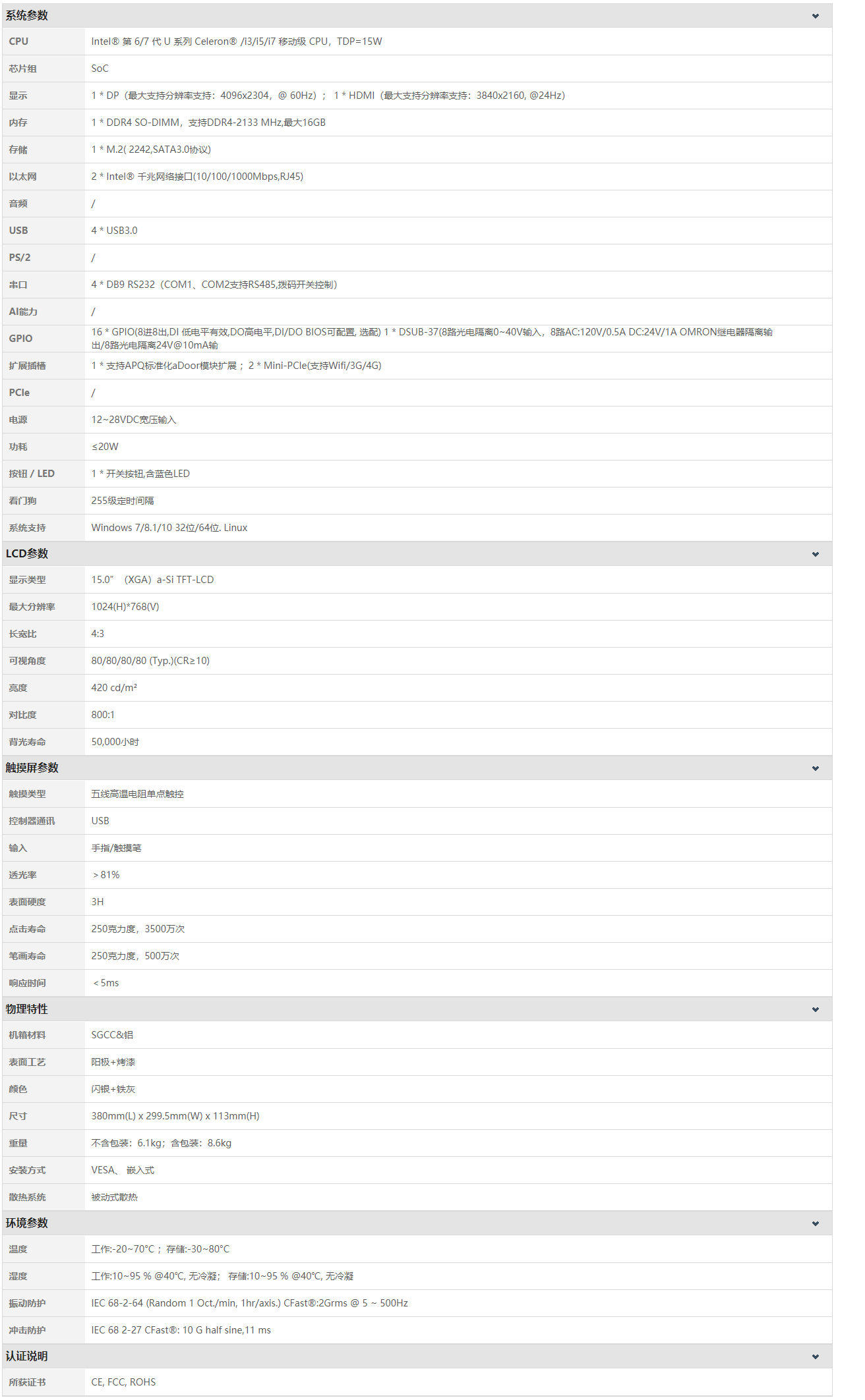 P150RF-E81采用全模具壓鑄成型的鋁合金殼體,使用大面積鋁鰭無風扇散熱設計,保障其堅固機身和高可靠穩(wěn)定運行。深度的模塊化設計可實現(xiàn)雙Intel千兆網(wǎng)絡或高速隔離IO,以及多IO接口的靈活擴展,更支持CPU核心模塊的快速升級迭代。前面板使用美觀PVC膜和高溫五線電阻式觸摸屏,達到IP65防護等級。實現(xiàn)最小尺寸的標準PCI/PCIe擴展卡的應用支持,寬壓電源輸入、雙隔離485、多路高速USB3.0和高清顯示輸出等特點, 適用于工業(yè)4.0、機器視覺、高速運算等多種不同應用場景。