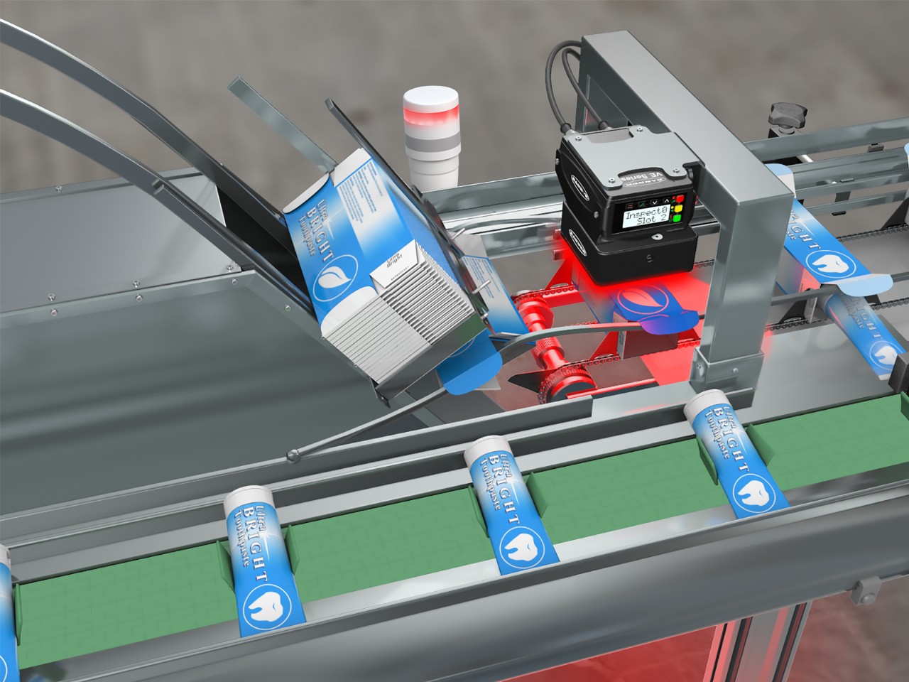 在裝入牙膏管之前,VE系列智能相機(jī)會事先檢查每個盒子上的產(chǎn)品標(biāo)志。當(dāng)盒子進(jìn)入檢查區(qū)域時,生產(chǎn)線上的