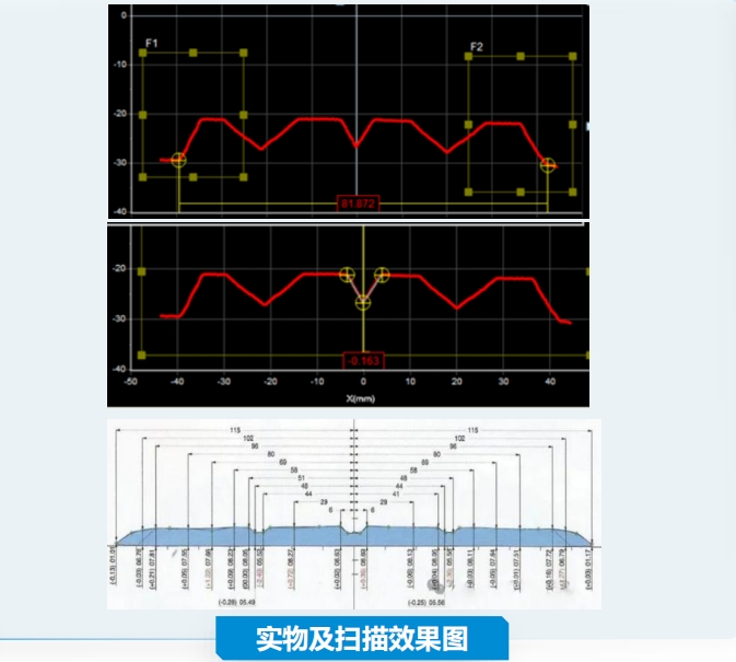 上下各兩個(gè)SR7400R,67mm/s,實(shí)時(shí)采集上下兩個(gè)面的輪廓線,在線測(cè)量各拐點(diǎn)距離、高度信息。