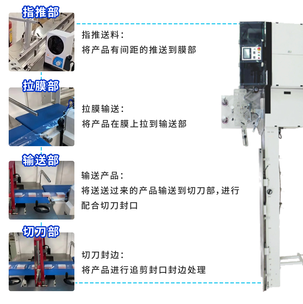 連續(xù)邊封機(jī)設(shè)備用于各類產(chǎn)品的包裝,屬于包裝行業(yè)第二道生產(chǎn)工序設(shè)備。主要由指推機(jī)構(gòu)、拉膜機(jī)構(gòu)、輸送機(jī)構(gòu)、切刀機(jī)構(gòu)四個大體機(jī)械模塊功能部分組成。