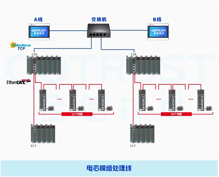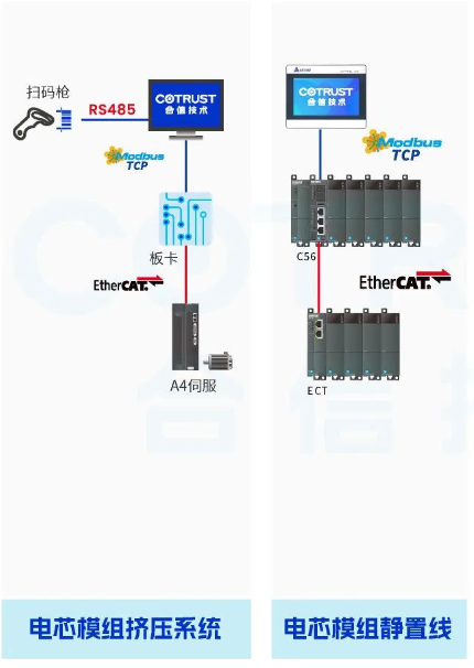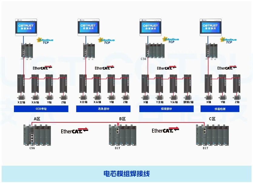 合信針對鋰電PACK線生產(chǎn)控制要求,提供PLC+伺服+HMI整套控制系統(tǒng)。