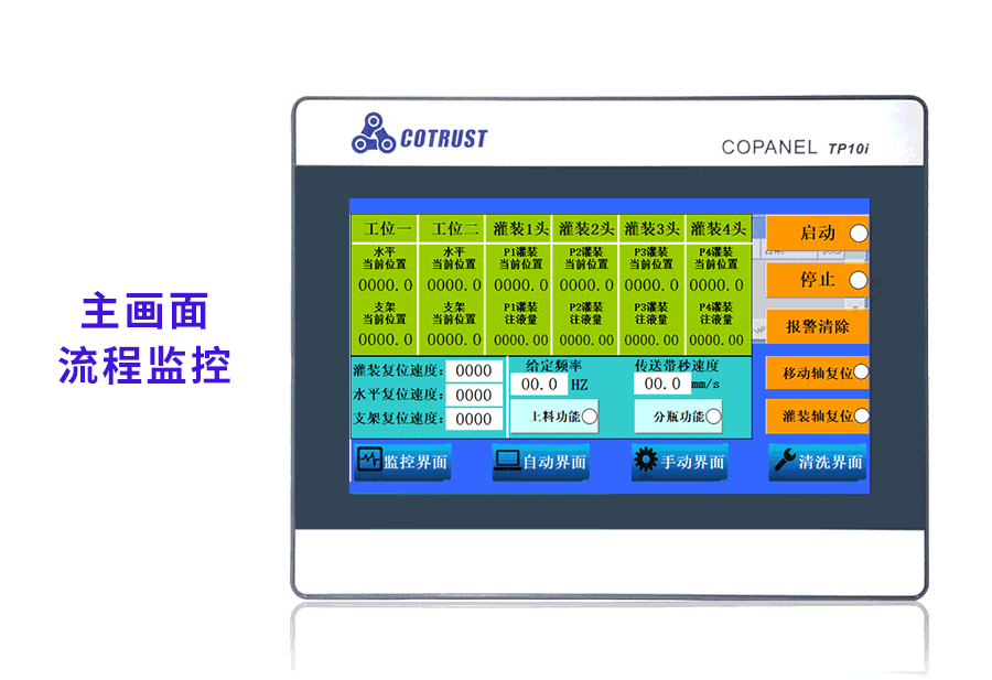 不同工位在觸摸屏上對應(yīng)位置按鈕,設(shè)置不同參數(shù),以及復(fù)位報警操作。