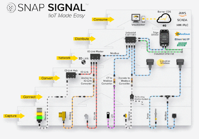 在邦納的IIoT產(chǎn)品組合的核心是Snap Signal,一個(gè)能提供實(shí)用機(jī)械數(shù)據(jù)的模塊化軟硬件套件。數(shù)據(jù)信號(hào)幾乎可以從任何制造商的任何新的或現(xiàn)有的來(lái)源捕獲,并且轉(zhuǎn)化成工業(yè)標(biāo)準(zhǔn)協(xié)定。然后,為了方便使用,可以把數(shù)據(jù)分配到本地,企業(yè)網(wǎng)絡(luò)或者云端。這樣就能完成并簡(jiǎn)化諸如數(shù)據(jù)采集,分析,以及可視化這些復(fù)雜的工作。因?yàn)镾nap Signal可以整合在工廠內(nèi)的所有傳感信號(hào),所以邦納可以建立一個(gè) I/O系統(tǒng),充分利用新舊設(shè)備提供的豐富數(shù)據(jù)。